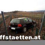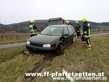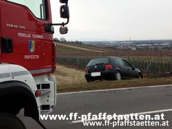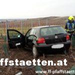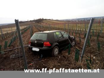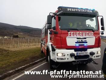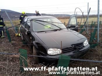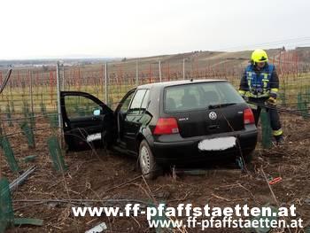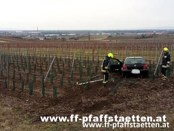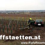 Am 12. Februar um 09:09 Uhr wurde die Freiwillige Feuerwehr Pfaffstätten mittels Pager zu einem Verkehrsunfall auf die Weinbergstraße gerufen. Aus bisher noch unbekannter Ursache hatte der Lenker eines schwarzen PKW aus Richtung Gumpoldskirchen kommend die Kontrolle über sein Fahrzeug verloren, mehrere Reihen eines Weingartens durchschlagen und sich in weiterer Folge in den Spanndrähten verfangen. Die Drähte wurden von den Kameraden der Freiwilligen Feuerwehr Pfaffstätten gekappt, das Fahrzeug anschließend mittels Seilwinde zurück auf die Straße gezogen und verkehrssicher abgestellt.