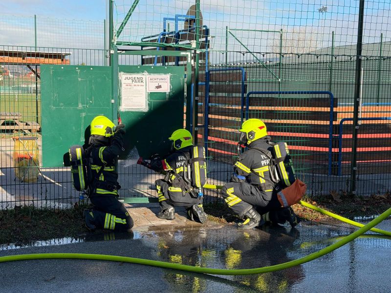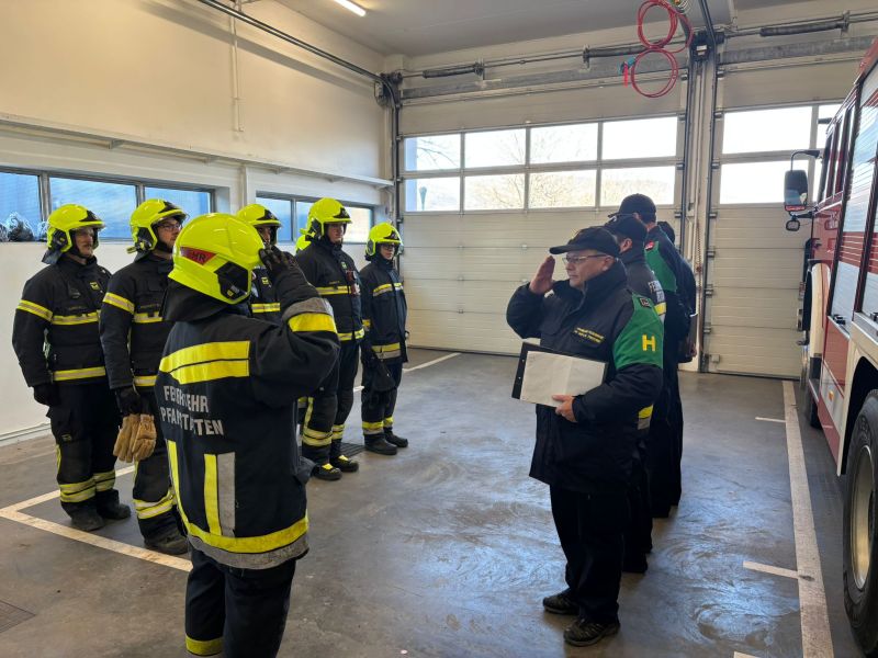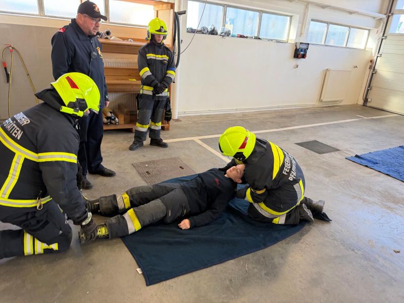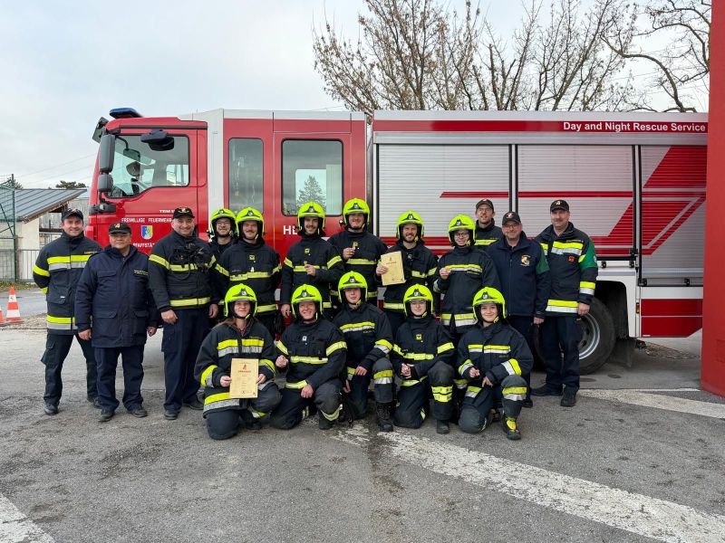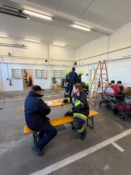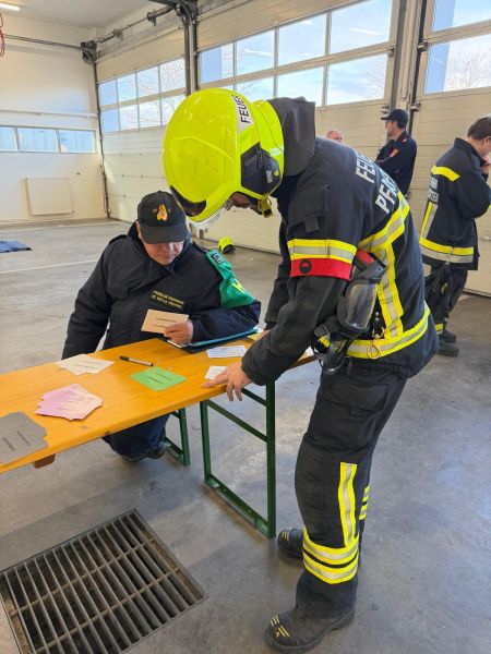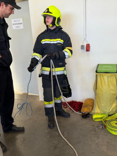 Im Rahmen der Ausbildungsprüfung wurden neben der praktischen Abwicklung eines Löscheinsatzes, auch Wissensüberprüfungen in den Bereichen Taktik, Geräte-, Gefahren-, Knotenkunde und Erste-Hilfe durchgeführt.