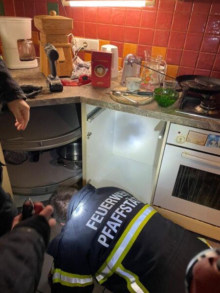 Ein Teil der Küche wurde zerlegt und der Kater herausgezogen um dem Besitzer übergeben. Wir waren für 1 Stunde mit 15 Mitglieder, KDO, Tank 1 und Rlfa im Einsatz.