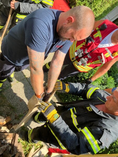Das Fahrzeug wurde mittels Wagen angehoben und mit Rangierroller seitlich vom Stein gehoben. Wir waren mit 13 Mitgliedern, KDO und Tank 1 im Einsatz.